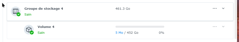 Dans mon cas, j'ai donc les deux partitions de DSM (système et swap), plus trois volumes en raid, ce qui correspond (à peu près pour le raid) à ce que j'ai :
