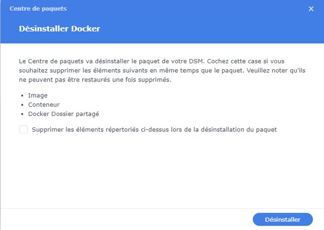 Il sera préférable de désinstaller le paquet docker en supprimant toutes les données concernant Docker : cela supprimera le dossier /volume1/docker, mais aussi /volume1/@DOcker et différents autres dossiers concernant docker.
