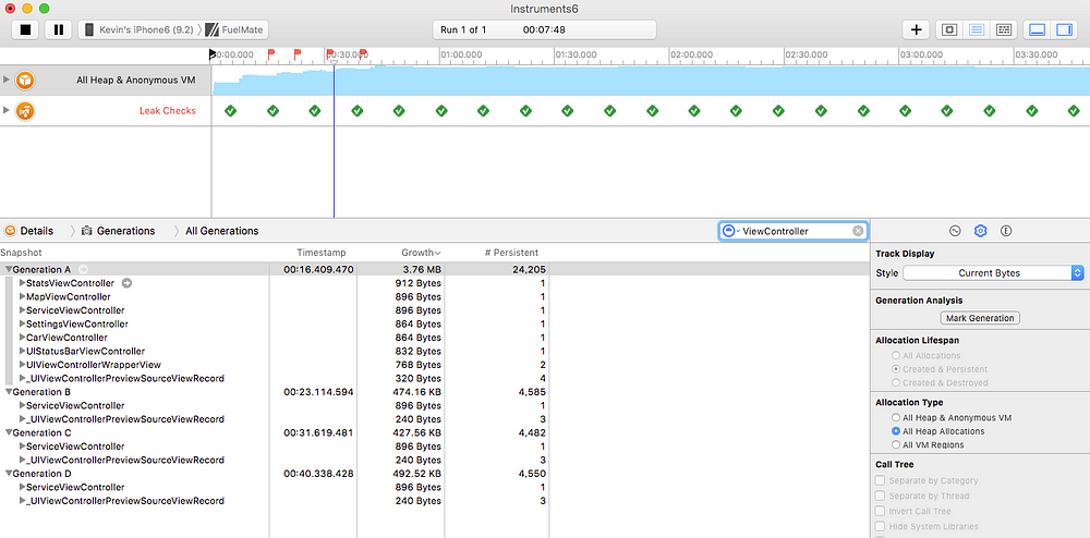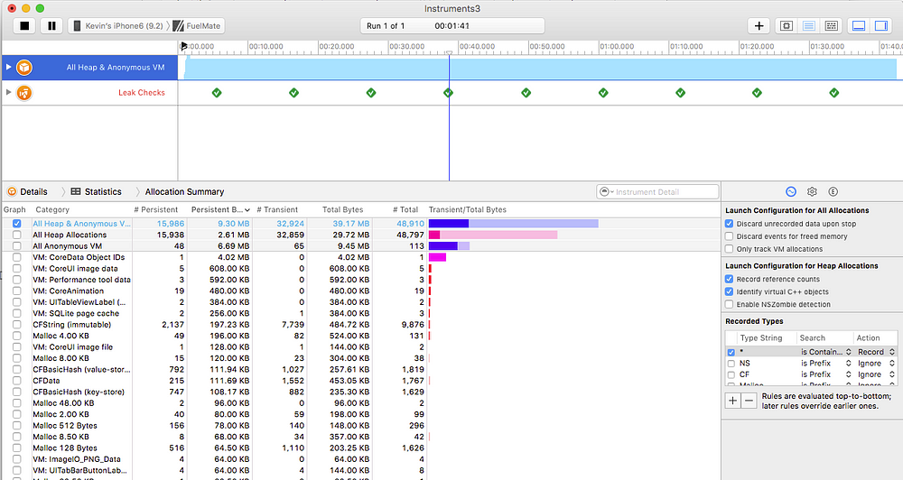 누수 패널에서 너무 자세히 설명하지는 않겠지 만 지정된 간격으로 스냅 샷을 가져 와서 할당되었지만 할당을 취소 할 수없는 메모리가 있는지 확인합니다. 이것은 Objective-C로 작업하고 할당 된 메모리를 해제 할 책임이있는 일부 C 라이브러리를 사용하는 경우 자주 발생합니다. 일반적으로 '분석'빌드 옵션을 사용하여 이러한 것들을 대부분 찾을 수 있지만 때때로 분석 도구에서 아무것도 찾지 못했지만 Instruments가 문제를 파악한 경우가 있습니다. Swift에서 작업하는 경우 Objective-C에서 수행해야했던 작업 중 일부를 처리하므로 이러한 누출이 덜 일반적입니다.