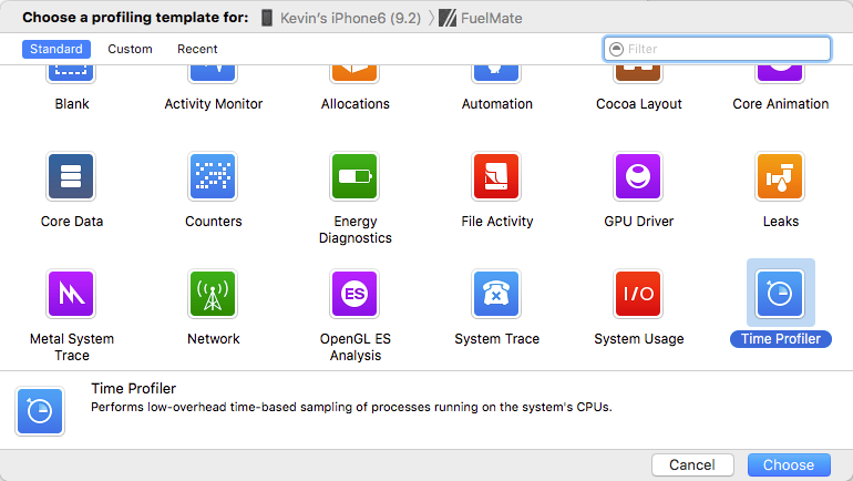 CPU 프로파일 링은 설정된 간격으로 실행되는 프로세스 샘플을 취하여 작동합니다. 기본적으로 1ms마다 샘플링되지만 필요에 따라 동작을 사용자 정의 할 수 있습니다. 스냅 샷간에 실행중인 프로세스를 확인하여 실행중인 프로세스의 기간을 결정할 수 있습니다. 프로파일 빌드가 끝나면 인스 트루먼 테이션이 시작되고 사용할 프로파일 링 템플릿을 묻습니다. CPU 사용량에 대해서는 '시간 프로파일 러'를 사용합니다.