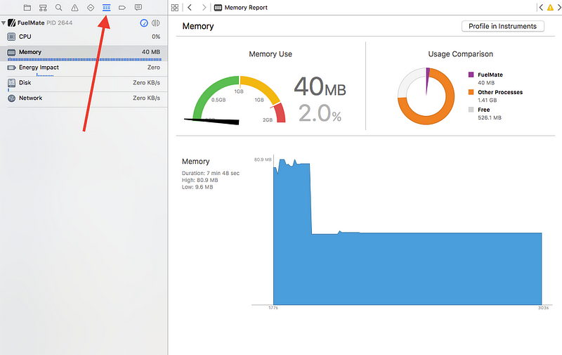 Xcode는 'Debug Navigator'를 확장하여 이전에는 Instruments 내부에 묻혀 있던 많은 정보를 포함 시켰습니다. CMD-6에 충돌하면 애플리케이션에 대한 성능 정보를 보여주는보기를 불러올 수 있습니다. 여기서 CPU / 메모리 / 에너지 / 디스크 / 네트워크 활동에 대한 간단한 요약을 볼 수 있으며 즉각적인 문제가 있는지 확인할 수 있습니다. 여기에서 맨 위의 '프로파일의 인스투르먼트 (Instrument in Profile)'버튼을 클릭하여 인스트루먼트를 시작하여 인스트루먼트에서 디버그 세션을 전송하거나 새 세션을 시작할 것을 요청할 수도 있습니다.