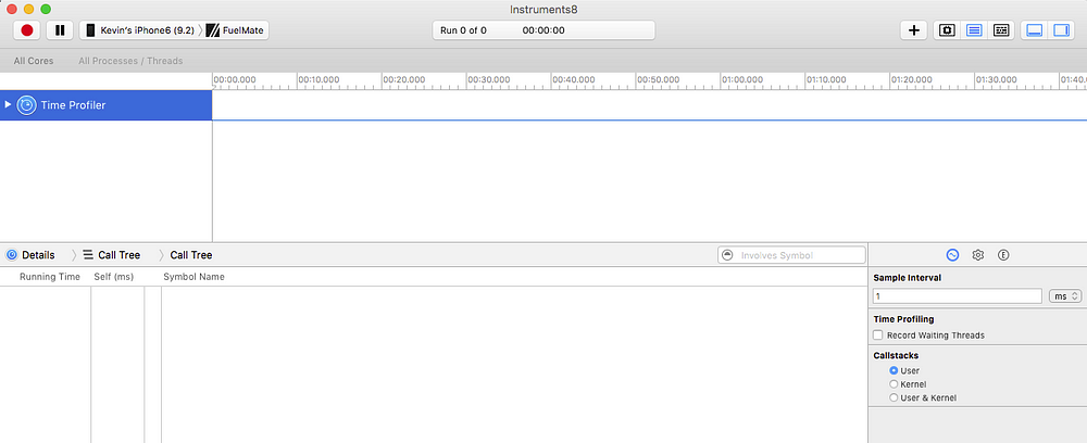 그러면 Time Profiler 뷰 설정으로 초기 인스트루먼트 뷰를 볼 수 있습니다. 이제 실제로 프로파일러를 실행하려면 프로파일 링을 시작 레코드 단추를 클릭해야합니다. 어떤 이유로 인해 기록 버튼이 비활성화된 경우, 프로파일러 트랙 오른쪽 상단에서 이유를 알려줍니다.