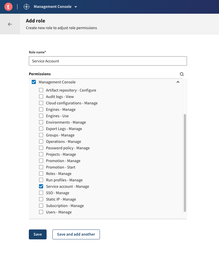 If the Service Account permission is not available, ensure that the Service Account feature is enabled.