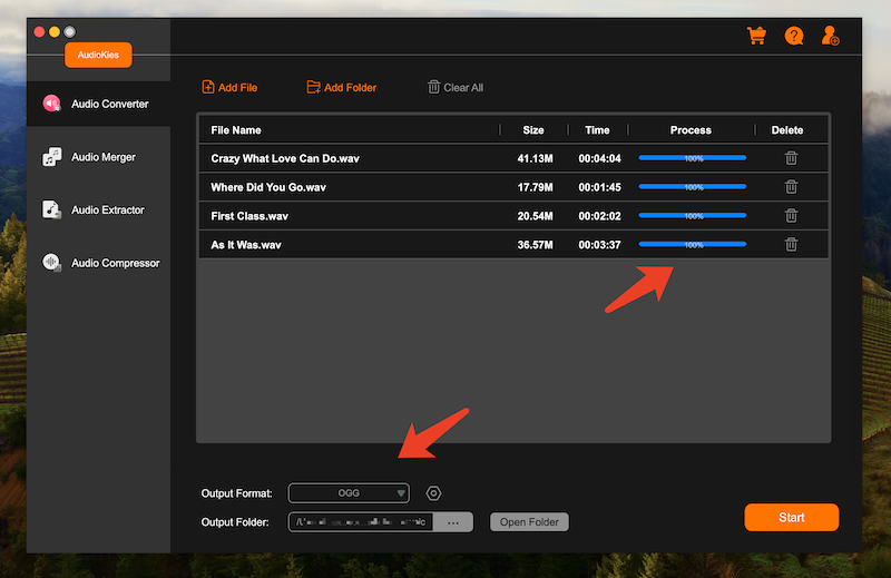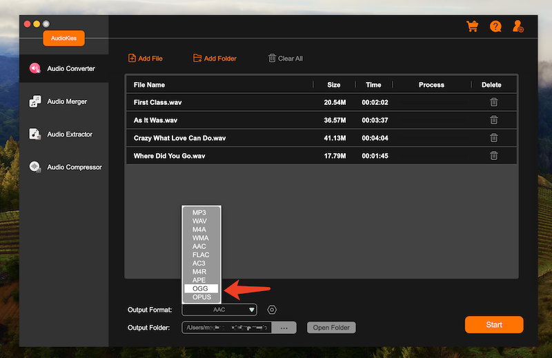 Open AudioKies app on your computer and click the Add File or Add Folder menu at the top to import WAV files into the program. Now, move to bottom and choose OGG as the Output format. Also select a local folder to save the converted files.