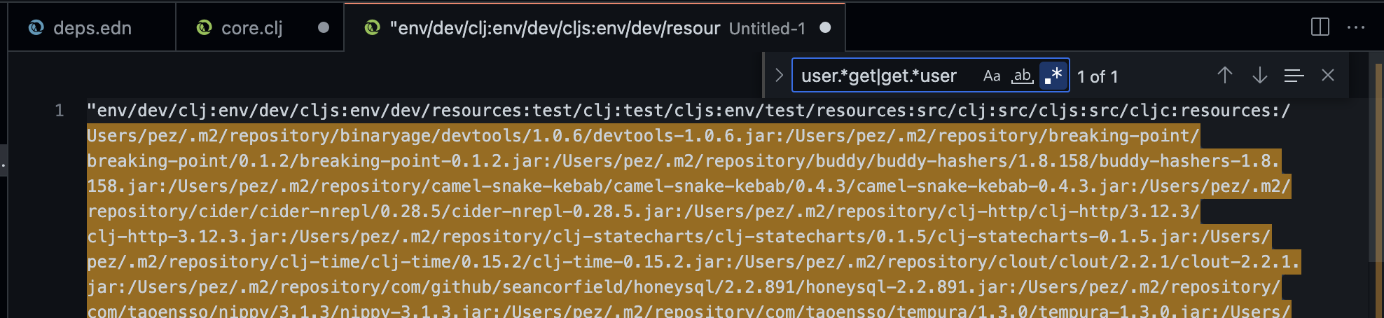 Searching long-classpath-string.txt in VS Code with the regex