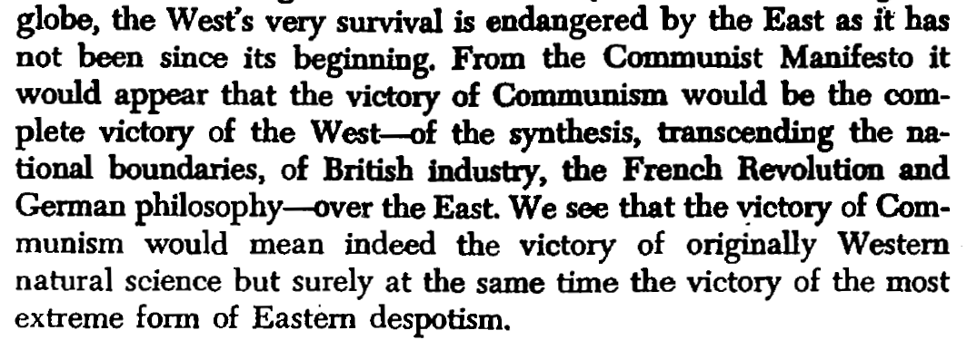 - [[Communism]] (in the East) is now threatening the West