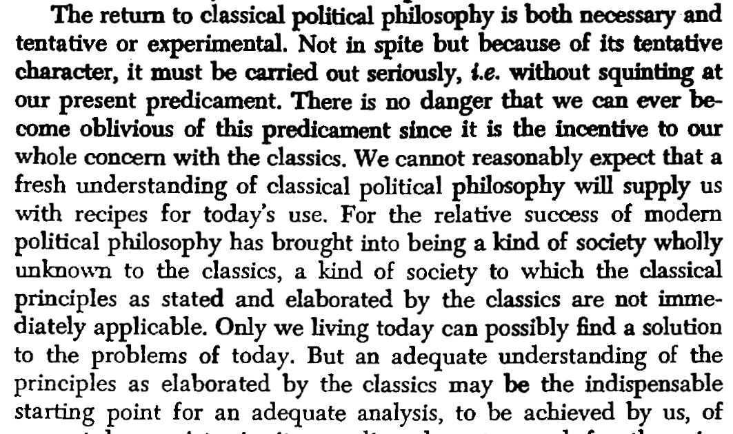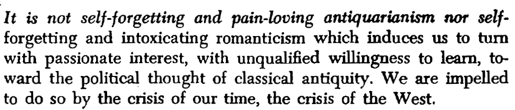 - ^^[[The crisis of the West]] is the reason to study political thought of classical antiquity^^ = to solve Western decline, we turn to philosophy