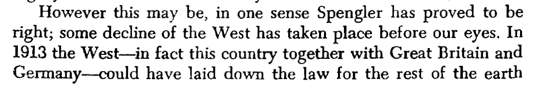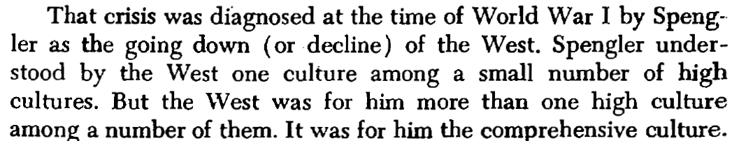 - This [[Contemporary Crisis of the West]] was diagnosed by [[Spengler]] as [[Western Decline]]