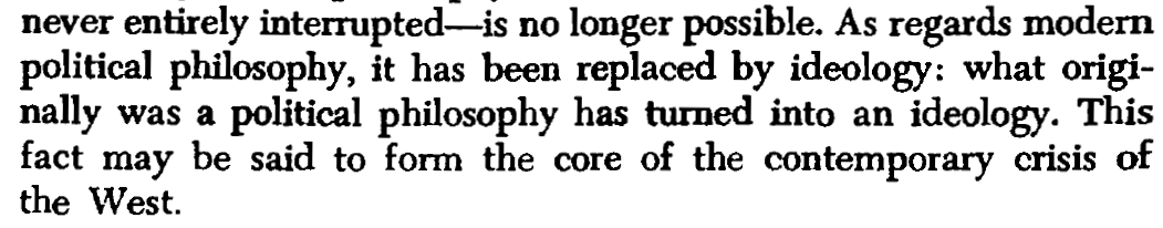 - Modern political philosophy has turned into ideology [[Contemporary Crisis of the West]]