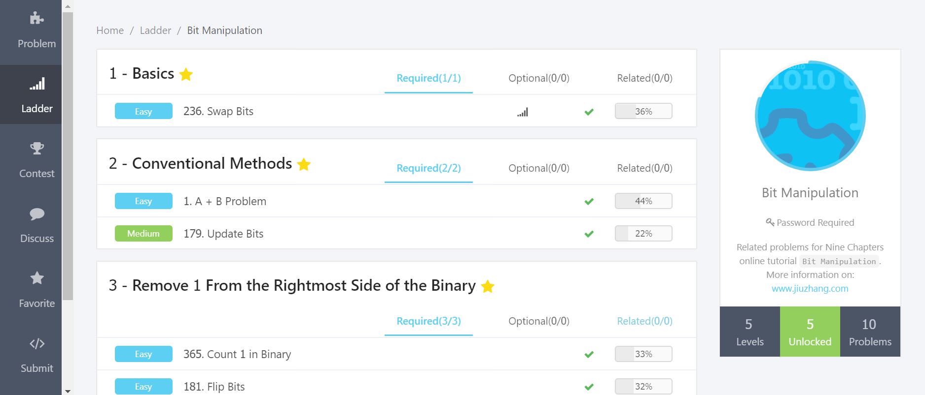 Lintcode 有一些 ladder 也還不錯,可以幫助循序漸進地刷題。比如說下圖的 bit manipulation ladder: