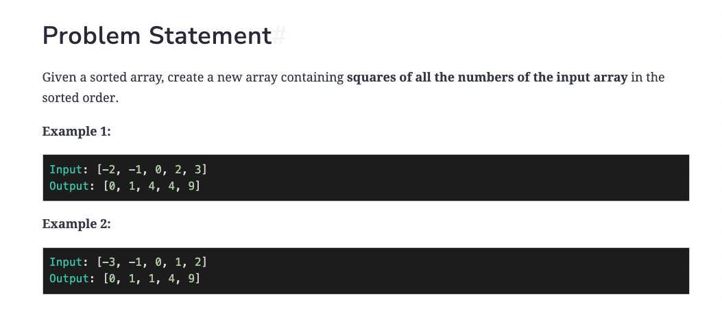 make_squares([-3,-1,0,1,2]) // [0,1,1,4,9]This is a straightforward question. The only trick is that we can have negative numbers in the input array, which will make it a bit difficult to generate the output array with squares in sorted order.