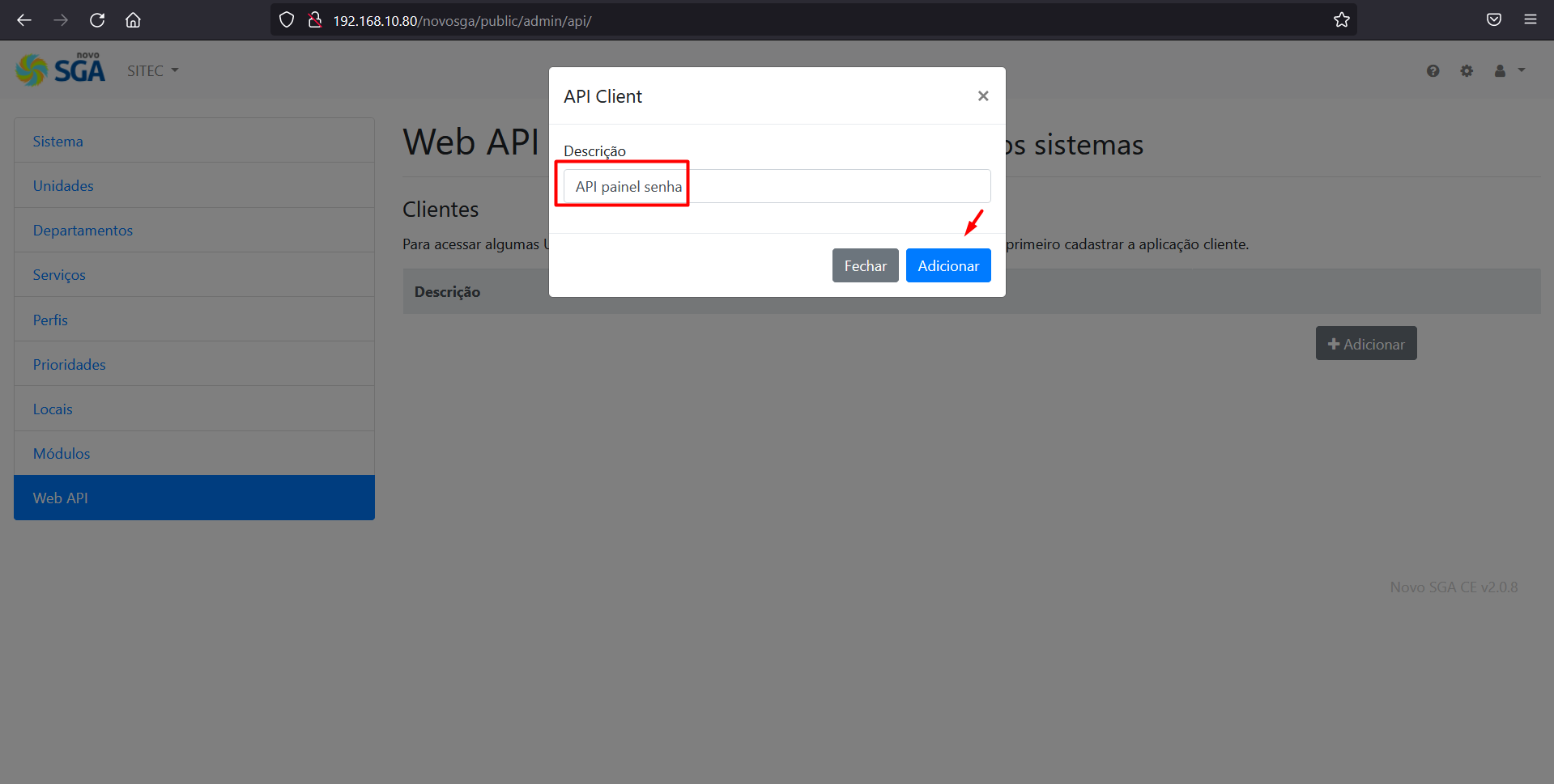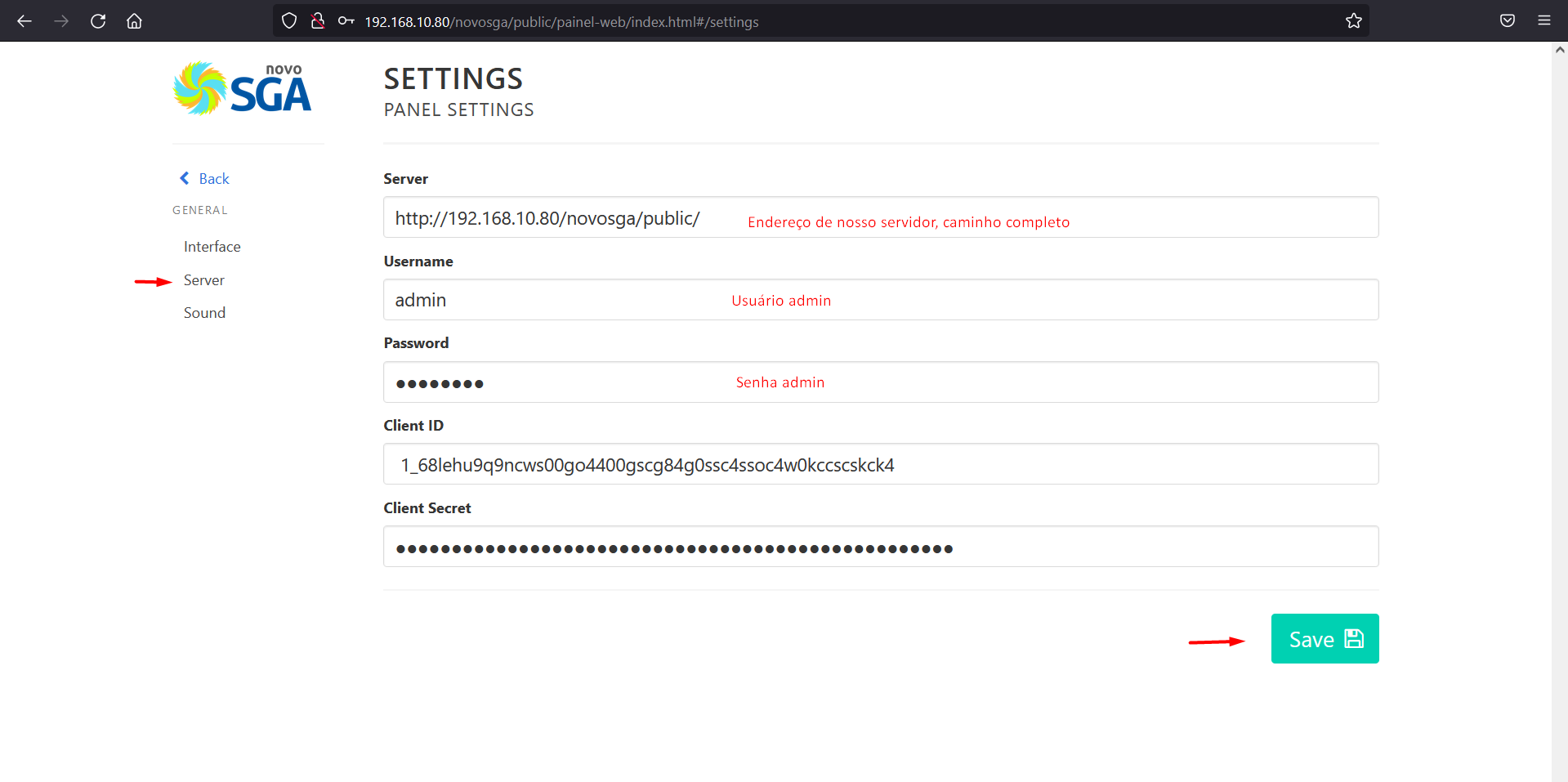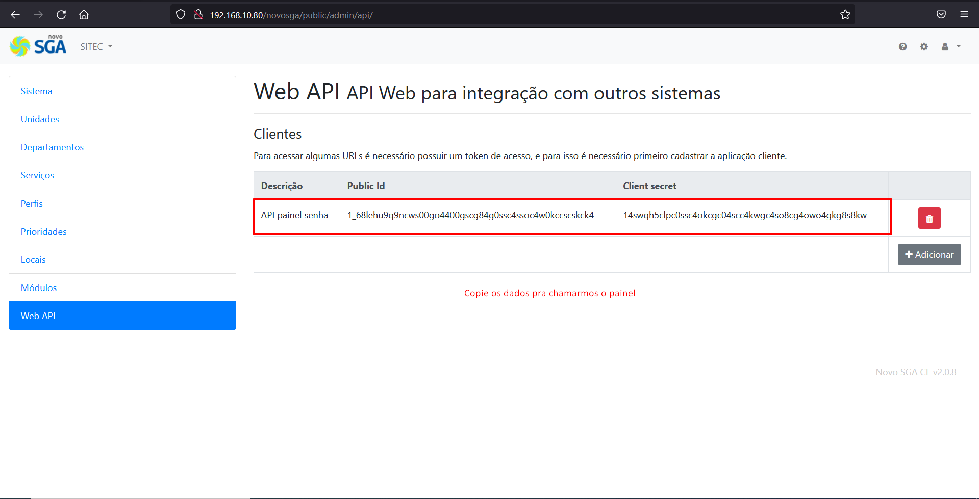 Volte no Painel de Senhas e cole as credencias copiadas e insira os dados do server (Local onde o SGA está hospedado), username e password do administrador do SGA.