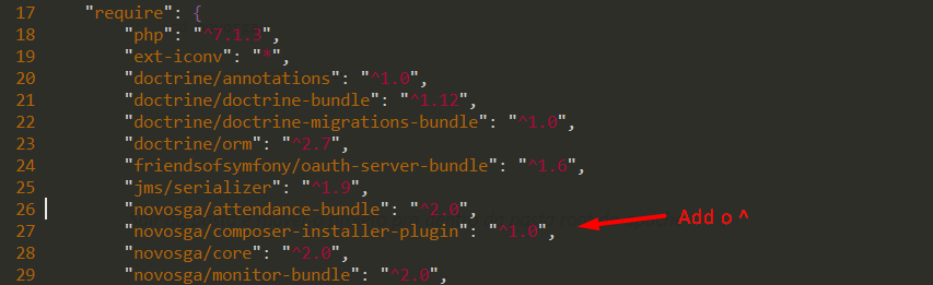 vim novosga/composer.jsonBusque pelo parâmetro destacado na imagem abaixo e adicione o sinal de ^ ficando assim ^1.0 para podermos trabalhar com versões superiores do composer, veja