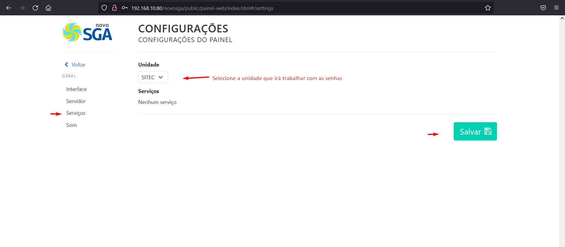 Definindo a unidade. Fazendo a integração do painel com servidor. Selecione a unidade e seus serviços disponibilizados.