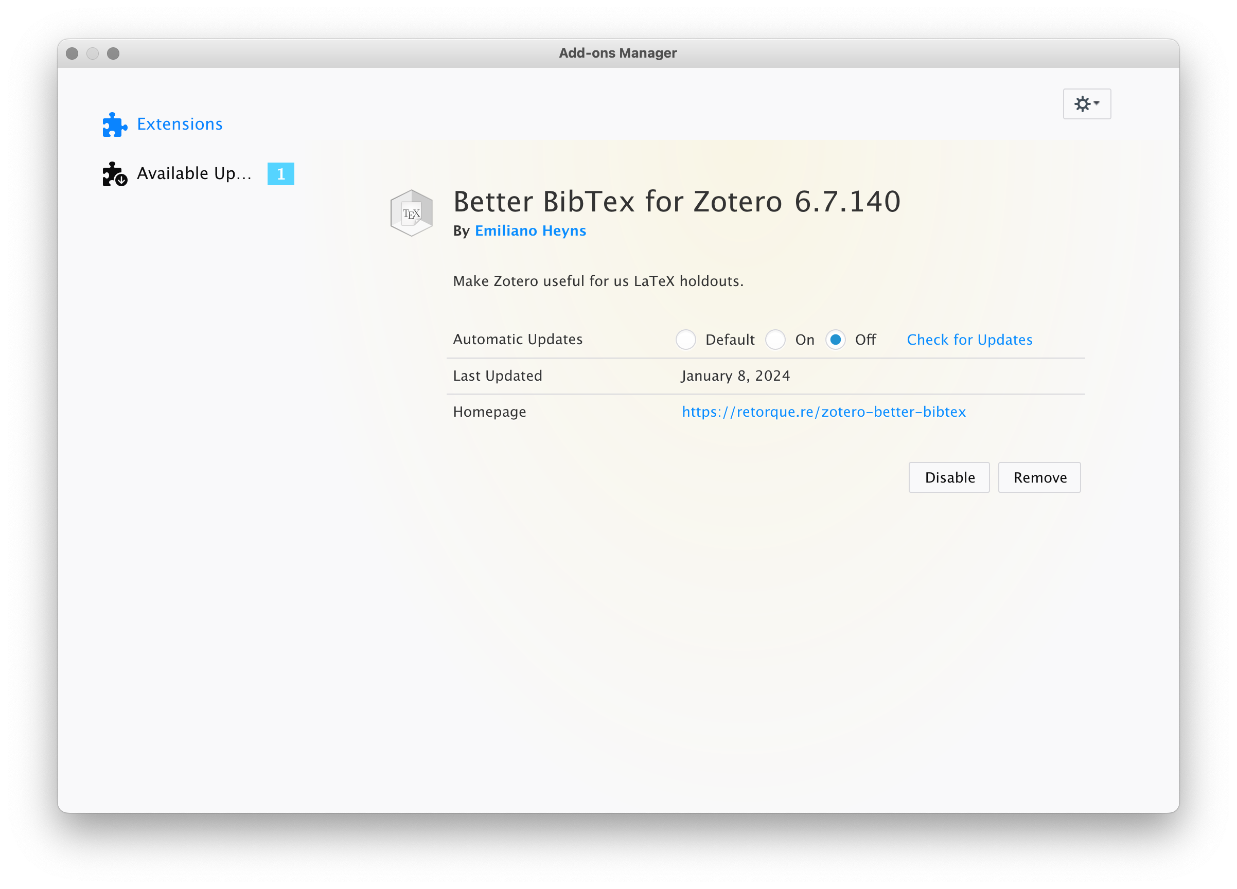 Install Better BibTex for Zotero in Zotero app. An instruction of Add-on installation is available here. Do not install ZotFile shown in the video. We will not use ZotFile.