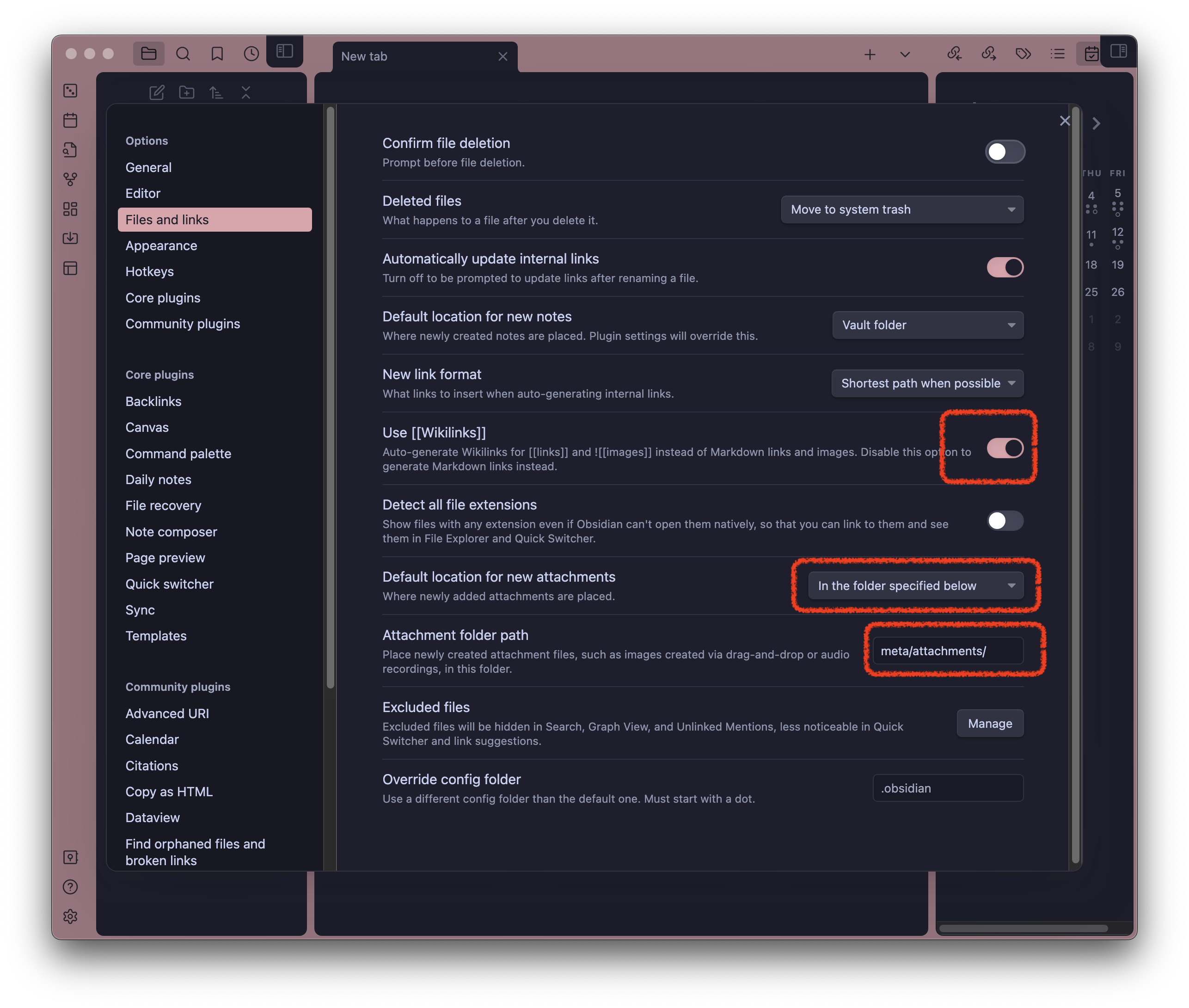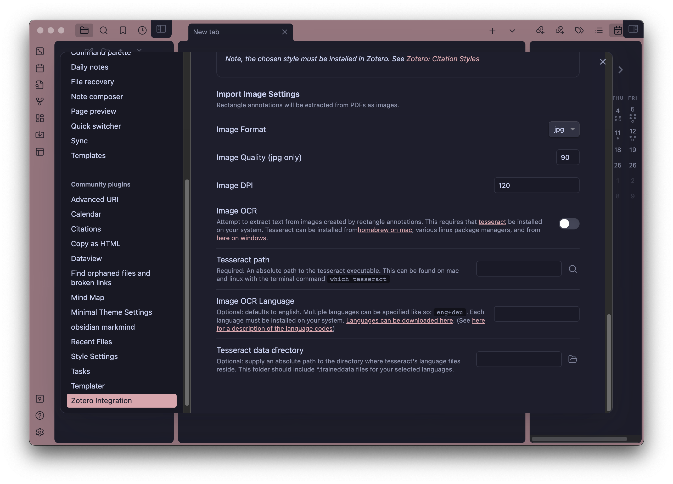Community plugins: Calendar, Citations, Copy as HTML, CSV Table, Dataview, Find orphaned files and broken links, Importer, Mind Map, Recent Files, Style Settings, Tag Wrangler, Tasks, Templater, Theme Picker, and Zotero Integration. -