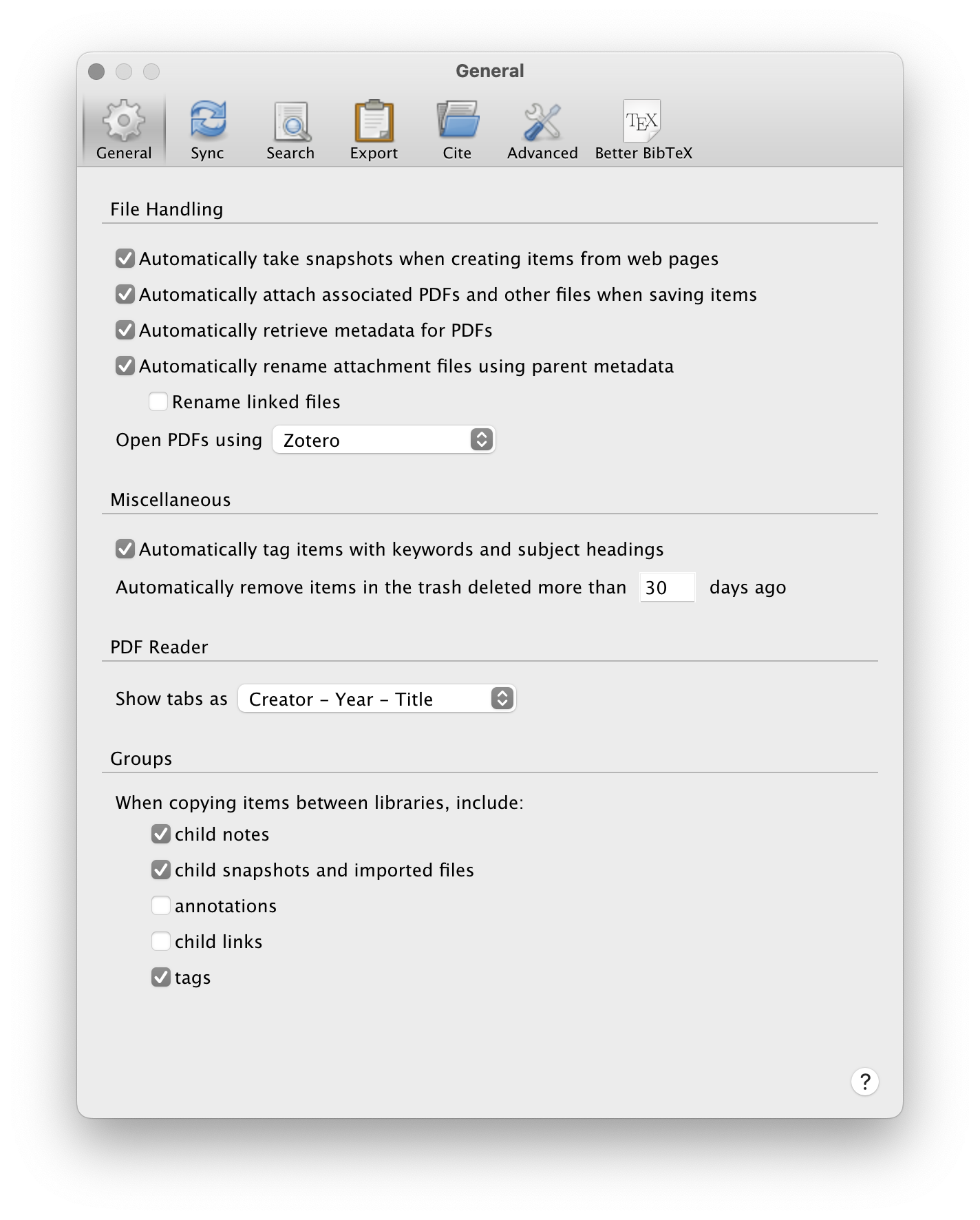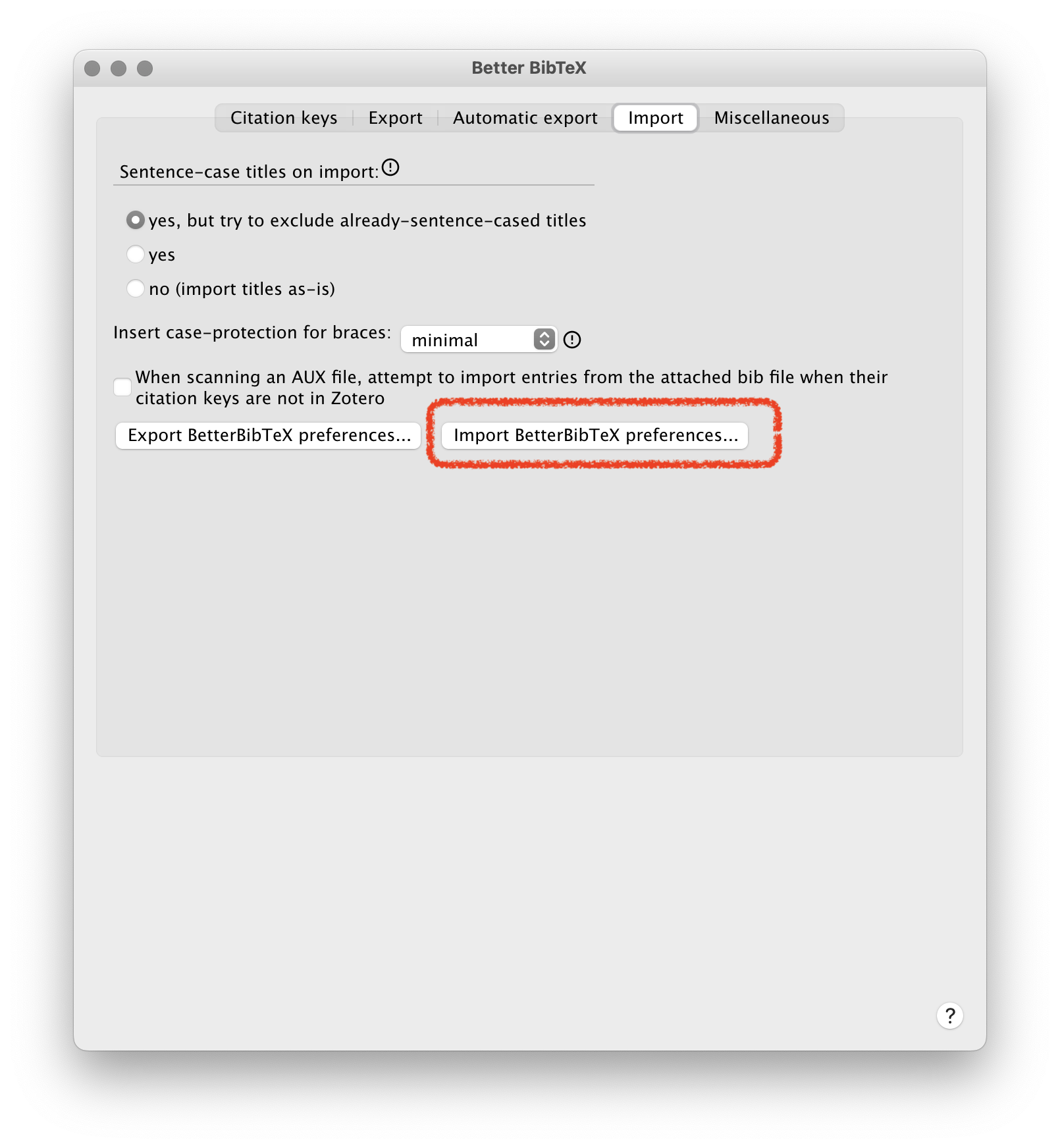 Importtab andImport BetterBibTeX preferences .... Then locate the file you downloaded above (shim-better-bibtex-setup.json) and then choose this file. This will make all necessary setups.