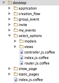 Each module has its own folder. The folder contains a definition file (index.js), a Controller and an optional Router. The rest of the Module's classes are contained in folders named by their roles (models, views etc).