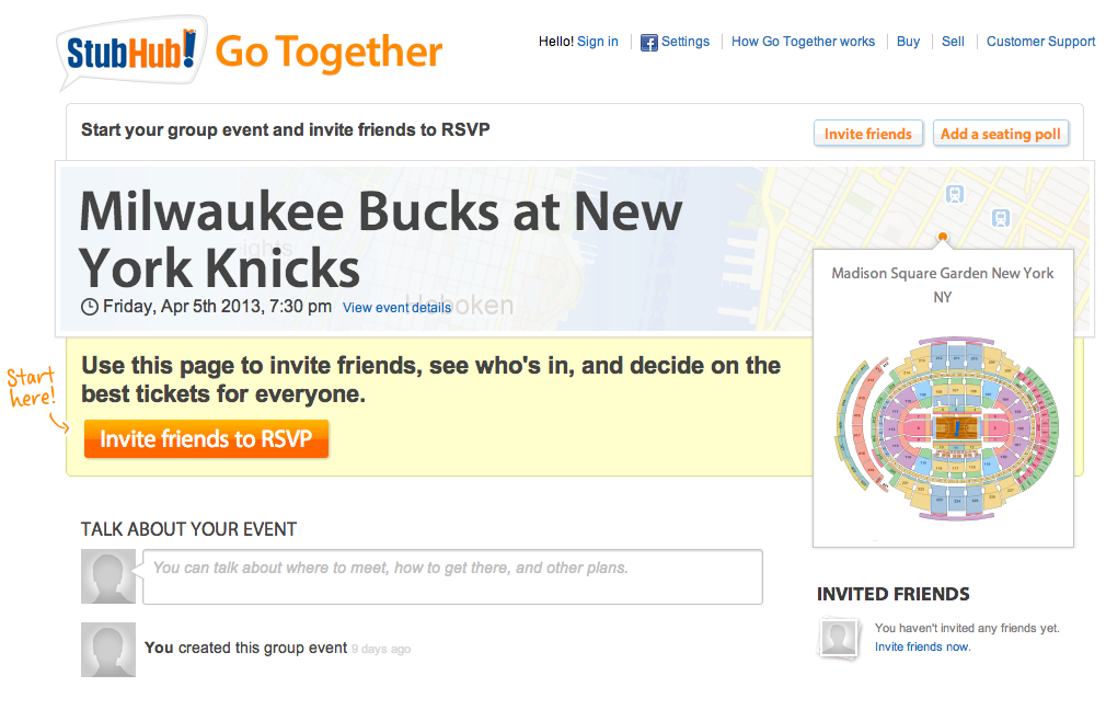 You can check the service yourself by going to StubHub, picking an event, and clicking the Go With Friends button at the top left.