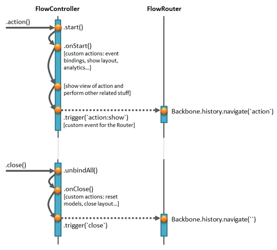 Instead, the AppRouter binds to Controller events on its initialize method (we had to add an EventBinder to Marionette's AppRouter). The Controller triggers these events at the end of actions: