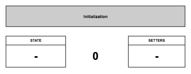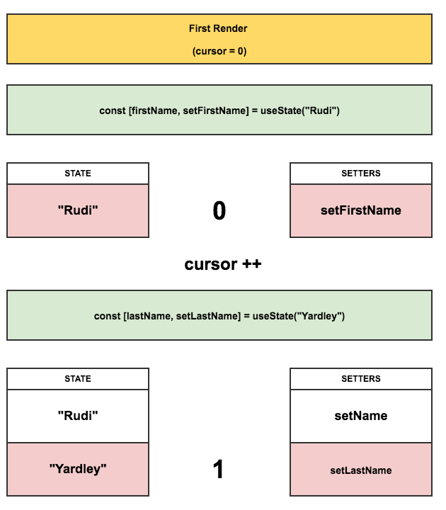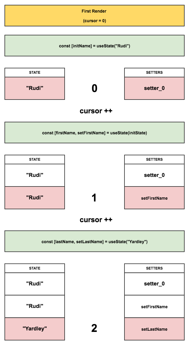どの useState() の呼び出しも、最初は、(カーソル位置に紐付けられた) setter 関数を setters の配列にプッシュし、state を state の配列にプッシュします。
