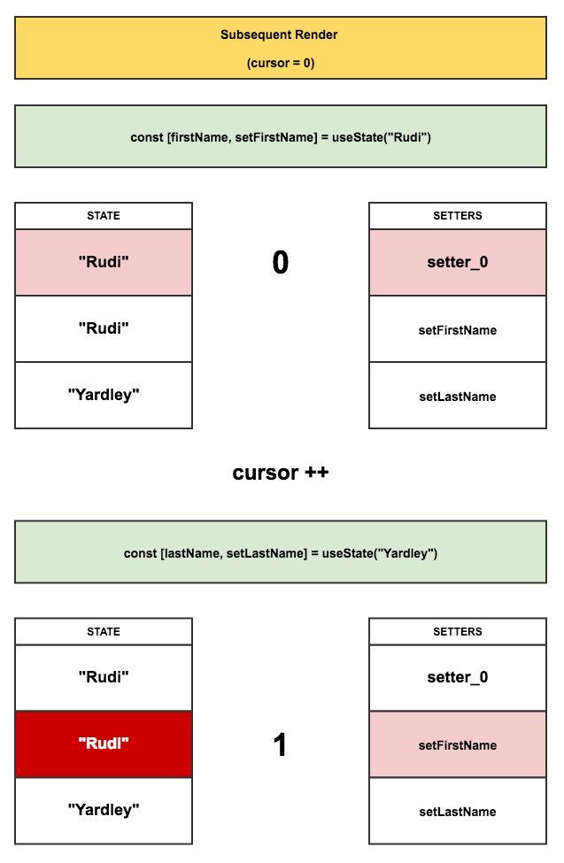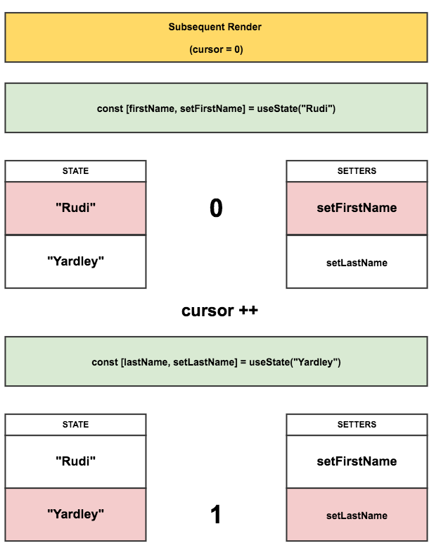 どの二回目の render もカーソルはリセットされ、これらの値は単に配列から読まれます。