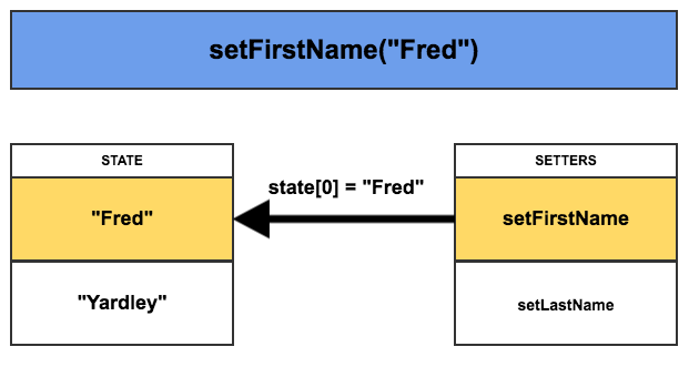 }Hooks API の裏にあるアイデアは、あなたが hook 関数の返り値の、配列の二番目の要素として setter 関数を使うことを出来るようにして、その setter が hook によって state をコントロールすることをできるようにする、というものです。