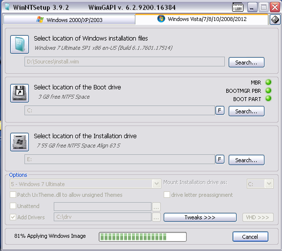 Start WinNTSetup and configure the 'installation'