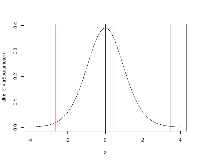 abline(v=(tr$conf.int[1:2] - tr$null.value) / stderr, col="red") # confidance interval | |