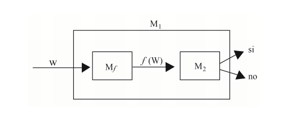 Sea Mf una MT que computa la función de reducción f, con w ∈ L1 ↔ f(w) ∈ L2, y sea M2 una MT que reconoce L2 y se detiene siempre. La MT M1 trabaja de la siguiente manera: