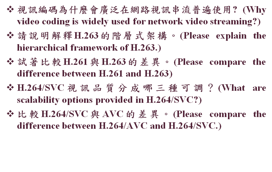 HomeWork4 視訊編碼為什麼會廣泛在網路視訊串流普遍使用? 可高效率視訊壓縮可以為應用來來巨大的改變,解決了檔案大小跟網路速度不成比的差距讓影片圖片都可以快速的傳播,多了很多應用的空間,以至於人們現在隨時隨地都能掌握即時影音資訊 應證了古人所說的一句話:秀才不出們便知天下事。 說明解釋H.263的階層式架構。