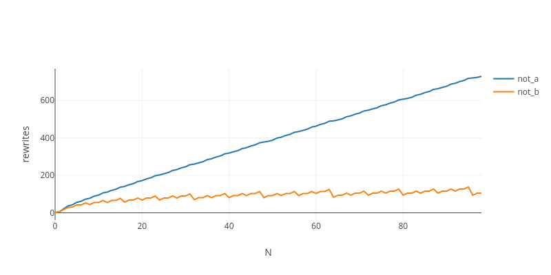Complexity (total rewrites) of applying “not” N times to True