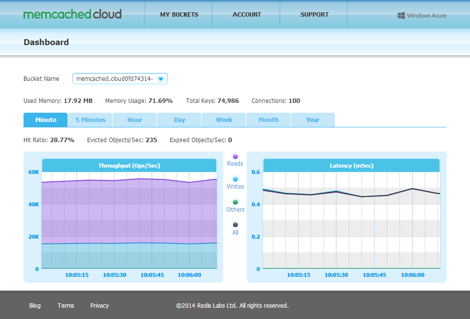 Memcached Cloud is a fully-managed service for running your Memcached in a reliable and fail-safe manner. Your dataset is constantly replicated, so if a node fails, an auto-switchover mechanism guarantees data is served without interruption. Memcached Cloud provides various data persistence options as well as remote backups for disaster recovery purposes. You can quickly and easily get your apps up and running with Memcached Cloud through its through its App Service add-on at Azure Store - just tell us how much memory you need and get started instantly with your first Memcached bucket.