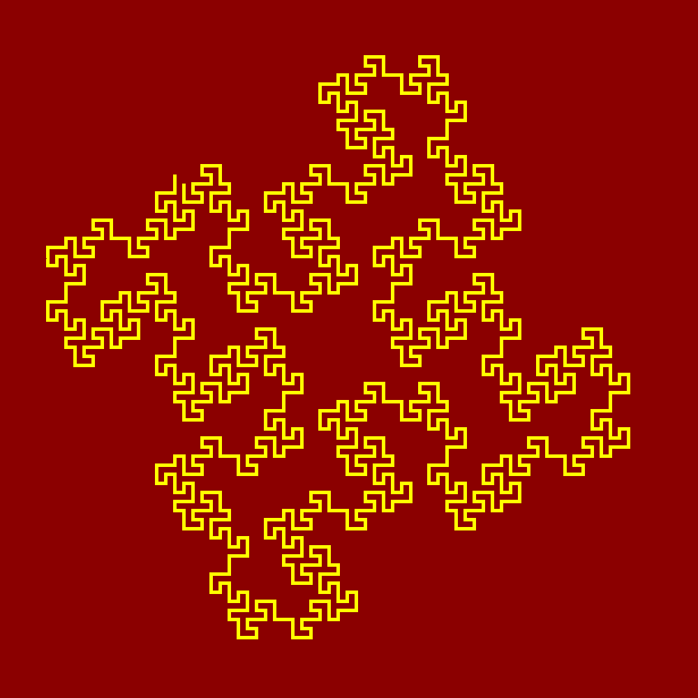eval echo "fbfbfbf" "| sed 's/f/faffbffbfbfafaffbfbfafaffaffbf/g'"{,} | grep -o [ab]*f | awk 'BEGIN{x=250;y=250;rx=0;ry=13} {tmp=rx; printf "%s,%s ", x,y; x=x+rx; y=y+ry; if($1=="af"){rx=-ry; ry=tmp}else if($1=="bf"){rx=ry; ry=-tmp}} END{printf "%s,%s", x,y}' | xargs -I@ convert -size 1000x1000 xc:DarkRed -fill none -stroke Yellow -strokewidth 4 -draw "path 'M @'" koch_island.png