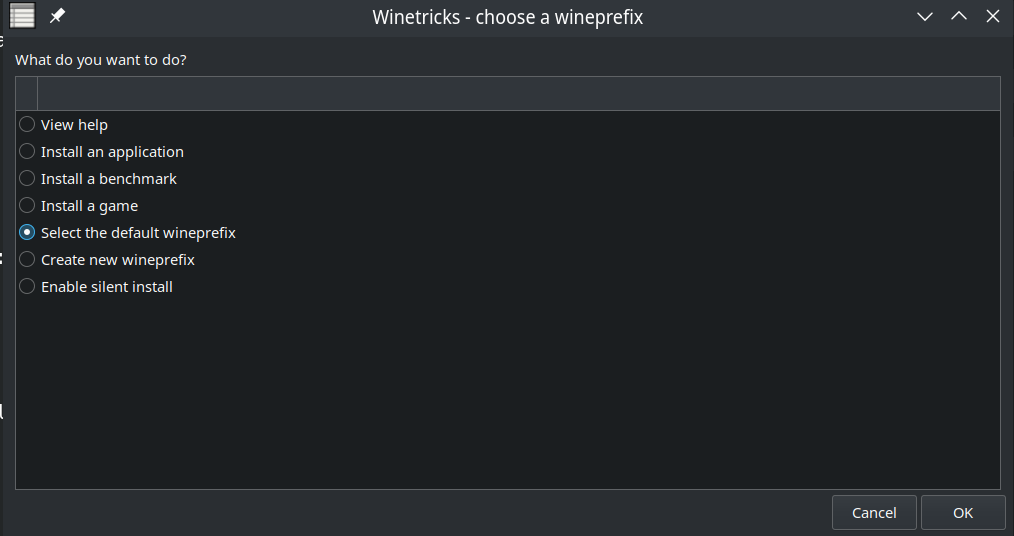 - proceed with the selected "Select the default wineprefix"