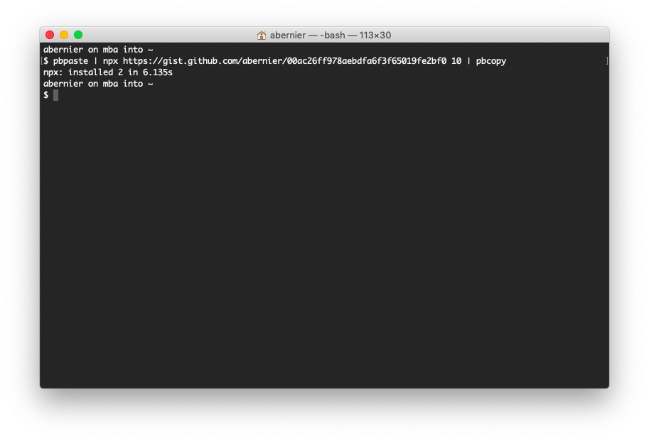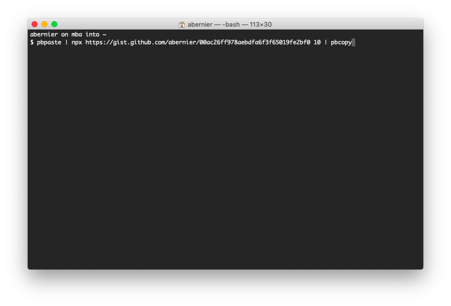 the following command ☝️😲WITHOUT EXECUTING IT:pbpaste | npx https://gist.github.com/abernier/00ac26ff978aebdfa6f3f65019fe2bf0 10 | pbcopy
