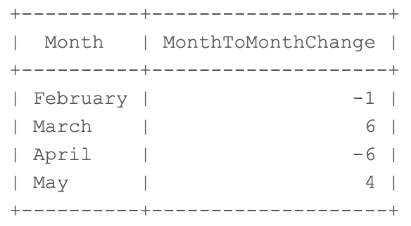 In this MySQL challenge, the table provided shows all new users signing up on a specific date in the format YYYY-MM-DD. Your query should output the change from one month to the next. Because the first month has no preceding month, your output should skip that row. Your output should look like the following table. https://coderbytestaticimages.s3.amazonaws.com/editor/challenges/ascii_user_logins.png