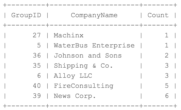 MySQL version: 8.0.23 In this MySQL challenge, your query should return the vendor information along with the values from the table cb_vendorinformation. You should combine the values of the two tables based on the GroupID column. The final query should only print out the GroupID, CompanyName, and final count of all rows that are grouped into each company name under a column titled Count. The output table should be then sorted by the Count column and then sorted by GroupID so that a higher number appears first.
