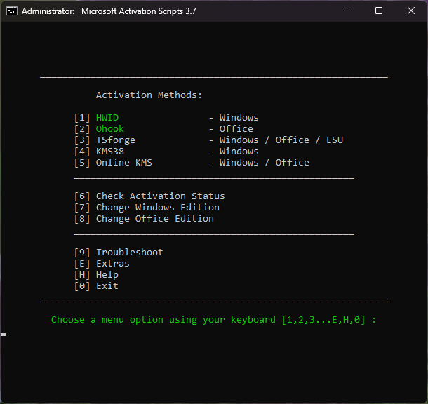 ![Screenshot of the Microsoft Activation Scripts 3.7 command-line interface. The menu lists activation methods including HWID, Ohook, TSforge, KMS38, and Online KMS for Windows and Office. Additional options include checking activation status, changing Windows or Office editions, troubleshooting, extras, help, and exit. The prompt at the bottom says 'Choose a menu option using your keyboard [1,2,3...E,H,0]:'.](https://i.ibb.co/5xxqpbBs/mas-screenshot.png)