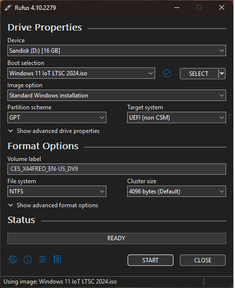 ![Screenshot of the Rufus 4.10.2279 application window configured to create a bootable USB drive. The device selected is 'Sandisk (D:) [16 GB]'. The chosen ISO is 'Windows 11 IoT LTSC 2024.iso,' with 'Standard Windows installation' as the image option. The partition scheme is set to 'GPT,' and the target system is 'UEFI (non CSM).' The file system selected is 'NTFS' with a 4096-byte cluster size. The status bar at the bottom indicates 'READY,' and the 'START' and 'CLOSE' buttons are visible.](https://i.ibb.co/B2mjmrYh/rufus-screenshot.png)