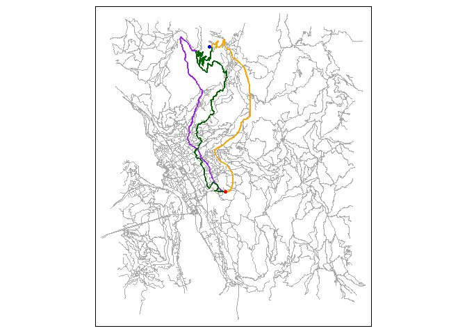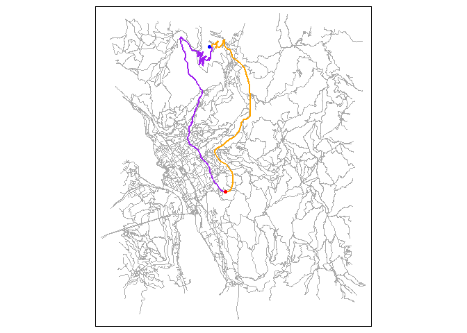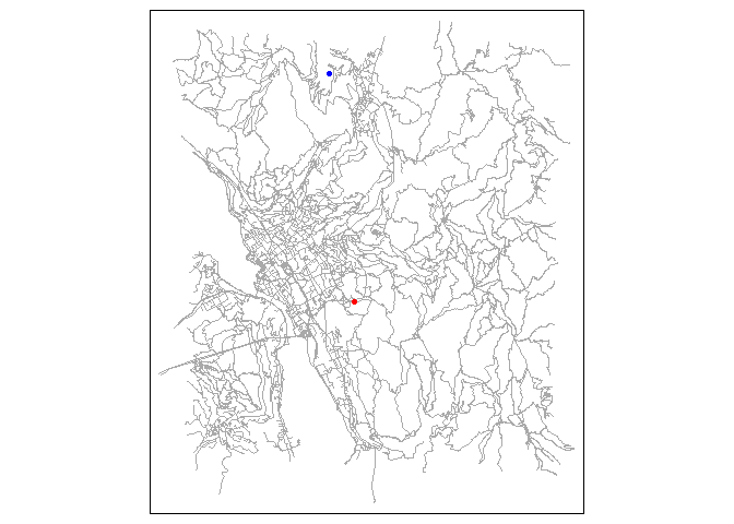 tm_dots(col = "blue", size = 0.1)# Estimate and plot the shortest path