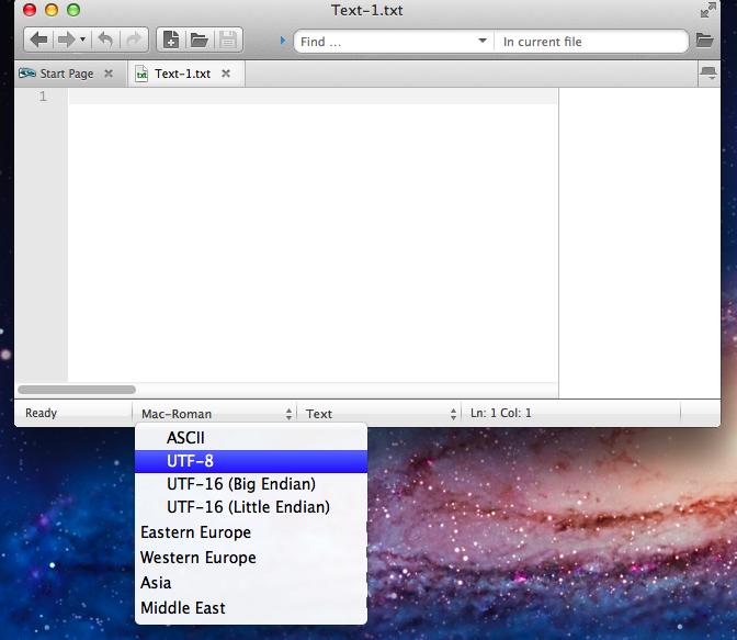 You might also notice that lines are not broken for you automatically. In a text editor, you must type a carriage return to make a line break part of the text file. However, all text editors have an option to "soft wrap" text---i.e., wrap it for display without inserting the carriage returns (those 0a bytes). In Komodo this is the "Word Wrap" option in the "View" menu.