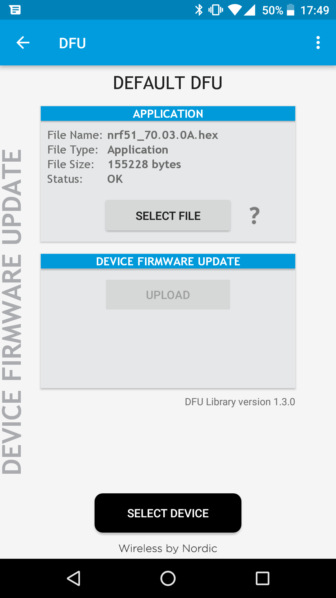 - Select firmware file → chose "application" type with "no init packet";