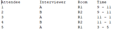 the output with no overlapping of the timings of the rooms and interviewers.
