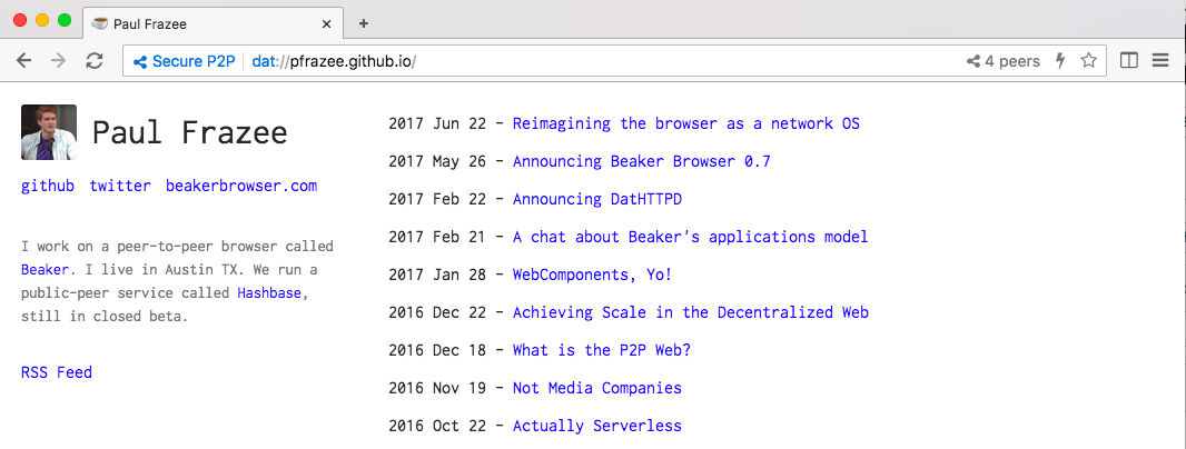 Before I used hashbase I used Github Pages, and today it dawned on me that I can have dat://pfrazee.github.io work too. It's pretty simple if you know the dat dns spec.