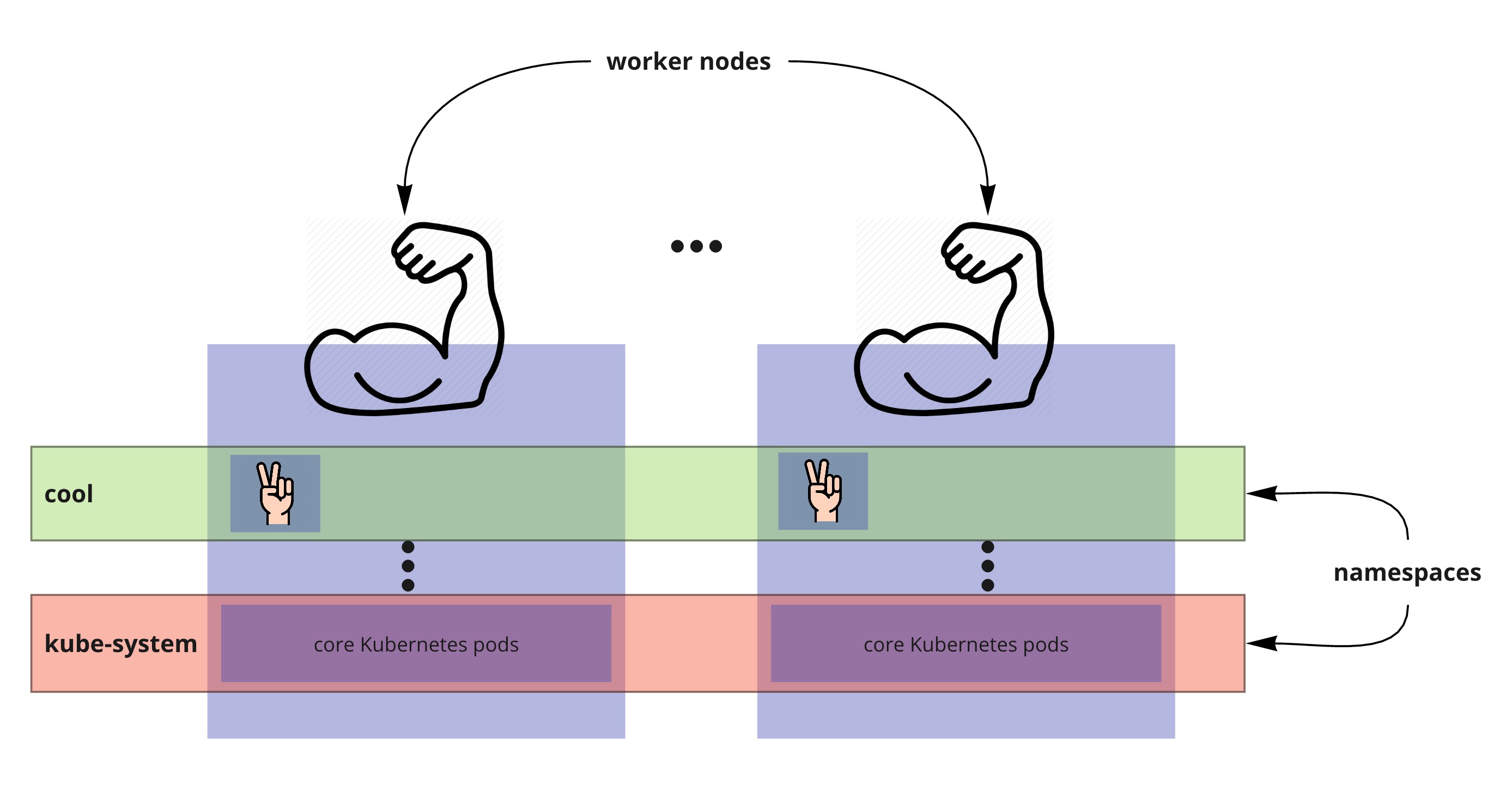 - In reality, pods might look more like this when it comes to namespace distribution across nodes