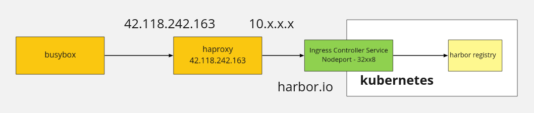 frontend harbor-ssl-passthrough bind *:443 mode tcp option tcplog default_backend be-harbor backend be-harbor mode tcp server harbor 10.0.0.51:31232 # same as Ingress-nginx service