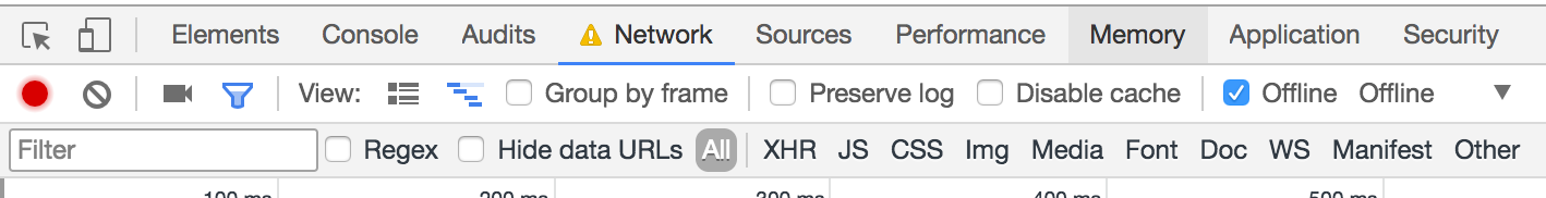 Next, open up the Developer Tools and go to the Network tab. Check the Offline checkbox.