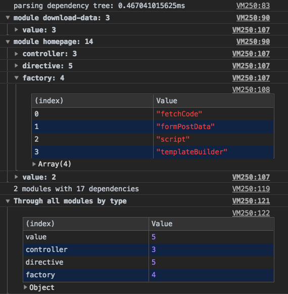 Returns AngularJS dependencies (injectables) list grouped by AngularJS app module. Run this script from console in Chrome.
