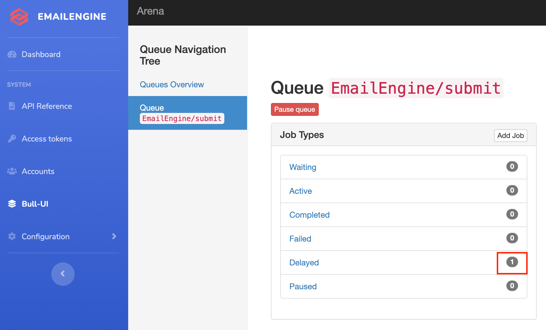 }While retrying you can see the job entry in the Bull Ui page under submit queue. The faield job should reside in the "delayed" section